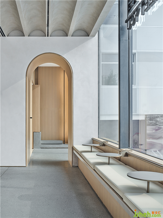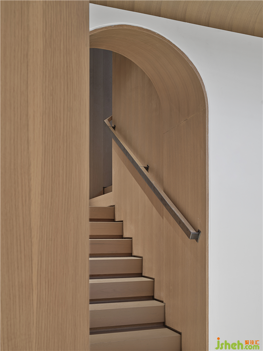 一層區(qū)域的視覺重點(diǎn)被設(shè)定在水吧區(qū)。開放式吧臺便于迎接訪客,水平線加強(qiáng)視覺的延伸感,敞開、開放的姿態(tài)帶來整體空間氣質(zhì)的平和。
