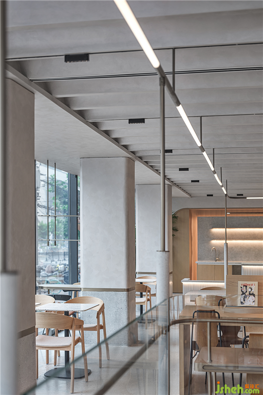 咖啡廳長桌縮減了陌生人之間的距離,加強(qiáng)自由的社交氛圍感。曲面天花如同跳躍的浪花,強(qiáng)化空間體量,秩序分明,動線清晰。