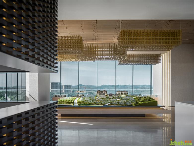 玻璃幕墻與灰色基底形成對比的調和。營銷中心設計一邊與自然無縫銜接,一邊落入舒適的人文逸境。局部座椅特設雅仕灰,廓形鮮明,線條簡凈,幾何形狀塊狀使其擁有豐富的趣味性。地毯細密網格有如沙石之色,圍合出靜謐安寧的氛圍。