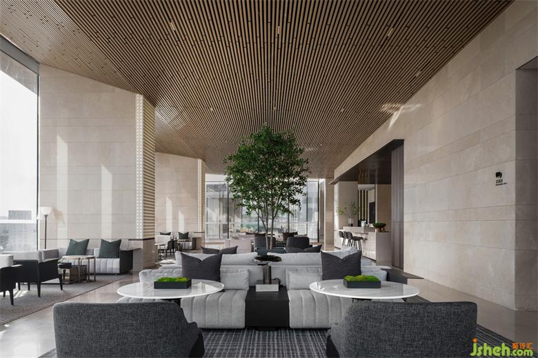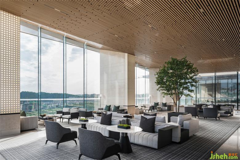 大面積的玻璃幕墻使建筑宛若一個盒子,方便設計師充分在自然中汲取靈感。以原木材質為基底,讓空間注入溫潤的自然,調節(jié)局部溫度。天花空間原木材質處理為細密的線條,創(chuàng)造更豐富的視覺層次。