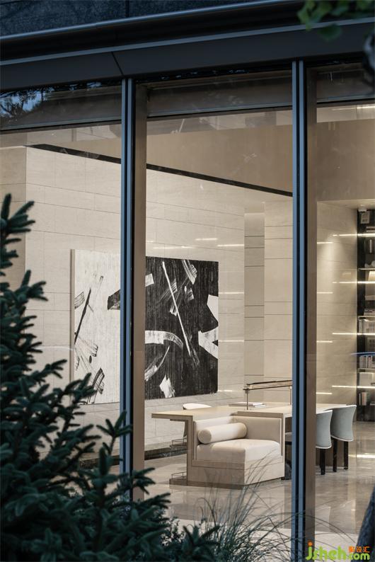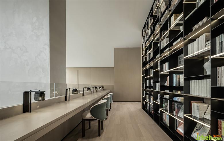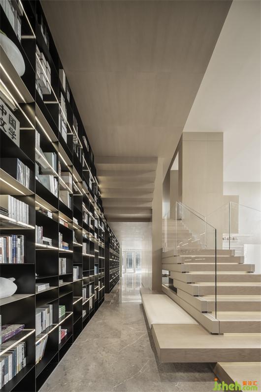 閱讀是對精神世界的探索,大量的書籍在此處拼裝成一道風(fēng)景線,與敞開式的空間對望。黑白色詼諧地交織變幻,背倚書閣書卷。