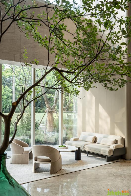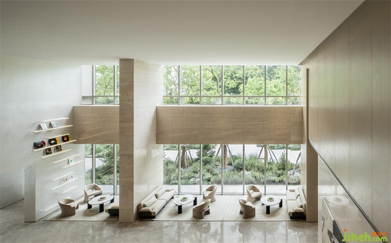 營銷中心設(shè)計豐富與自然緊密相連的特征,大幅玻璃幕墻最大程度引入自然光,使朗闊的休憩區(qū)成為一處溫暖、有生氣的場所。直線在分割界面形成一道律動,與戶外綠色交織,氤氳都市生活的浪漫韻律