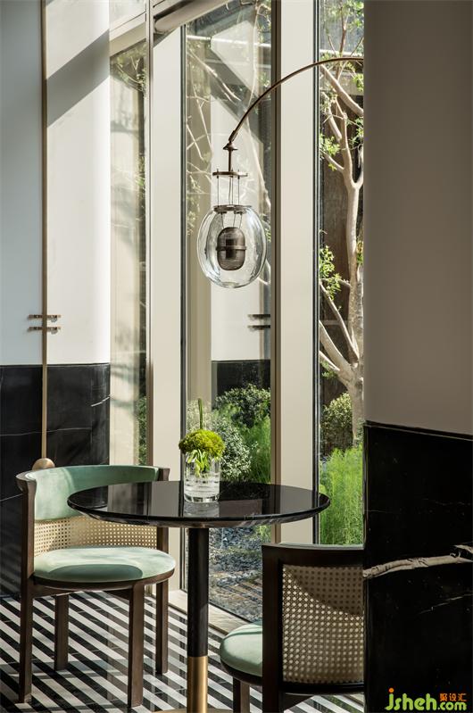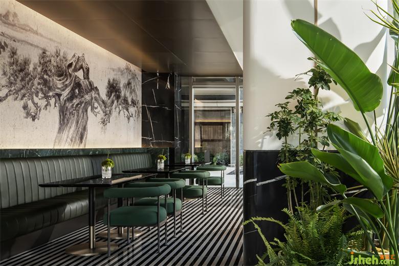 變化的光線天然調(diào)節(jié)室內(nèi)光線,落地窗成為富有韻律的畫框,座椅融于環(huán)境。東方意境的畫作于墻面延伸,成為空間“松月”意境的引申。柔軟的織物包裹著硬朗的形體,座椅本身就是“松”形態(tài)的寫就,與海派風(fēng)光融合,餐食環(huán)境不拘一格。