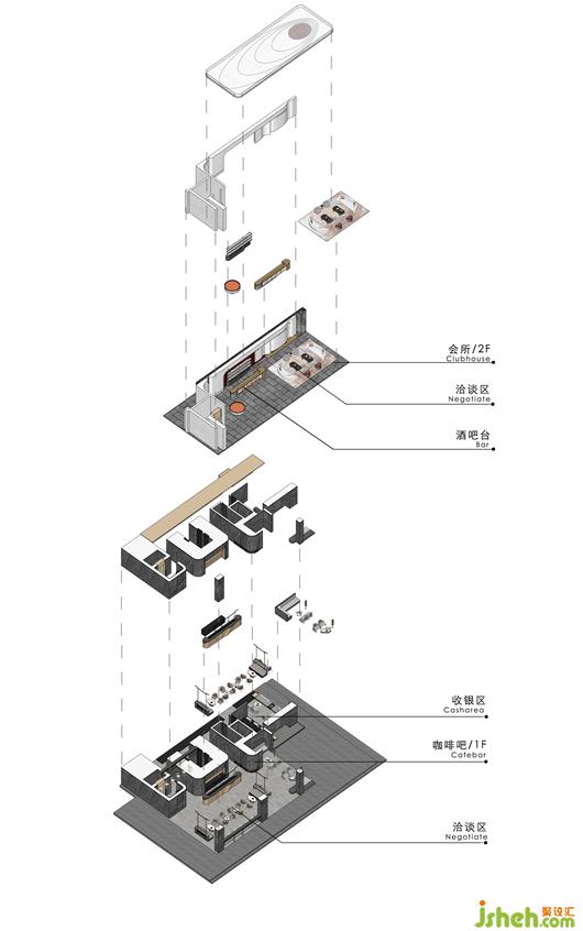 設(shè)計(jì)師希望在街區(qū)式的體驗(yàn)空間為都市休閑生活找到靈魂歸屬,一層為咖啡吧,二層為帶有酒吧功能的會所。暢快、恣意的工業(yè)風(fēng)被融入其中,意圖呈現(xiàn)放松感,以溫柔的月光色譜出光的曼妙旋律。