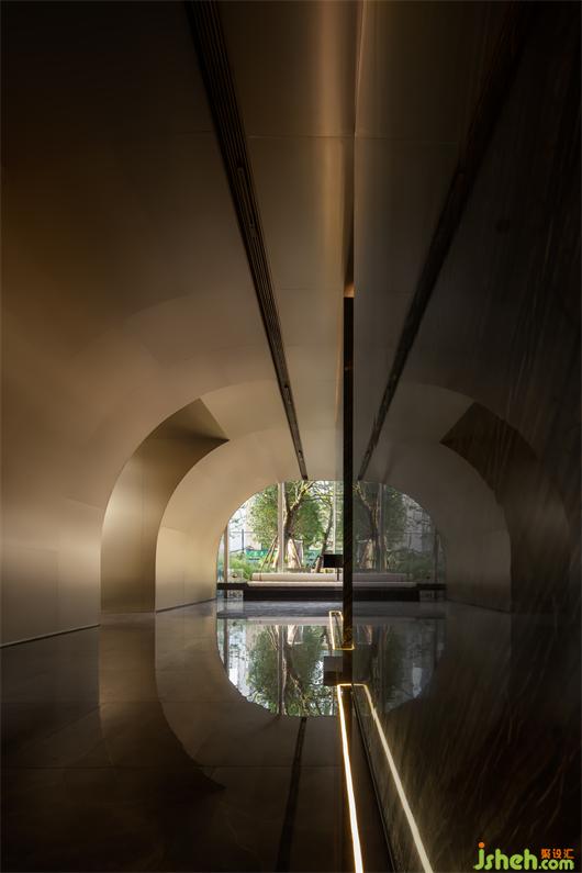 金屬色澤照著燈光的繾綣,與大理石地面倒映出似湖泊面的平靜,一種彼此關(guān)照與對稱的美。將人流與脈絡(luò)無限激活,打造極具在地文化感與國際視野的內(nèi)容設(shè)計(jì)。