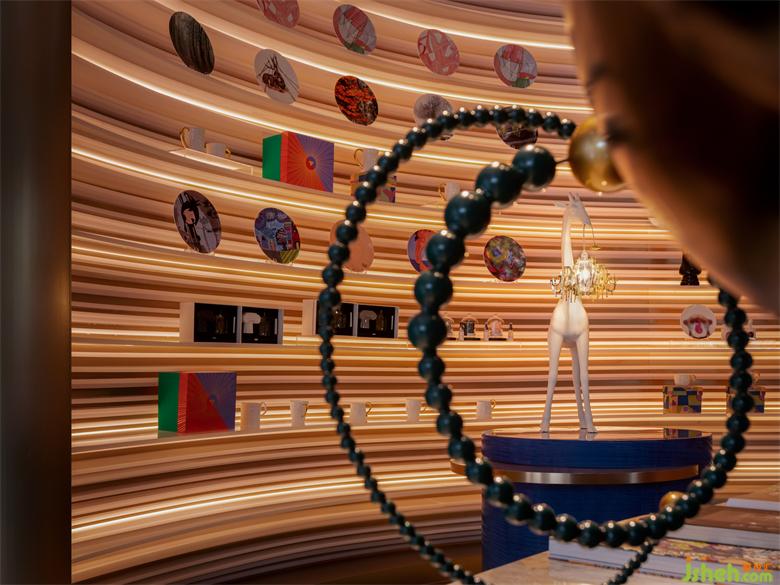 展示廳創(chuàng)造了一個虛幻的世界。曲面的展廳帶來極具張力的感受,琳瑯的陳列色彩極盡豐富。
