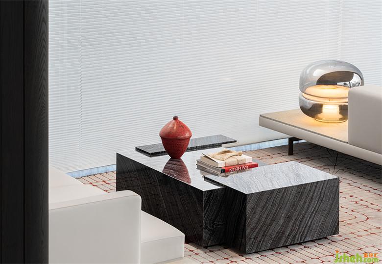 視覺感的碰撞在細(xì)微處捕捉,玄色原木與大理石茶幾鑲貼,淳樸的木質(zhì)肌理與石頭,矛盾且統(tǒng)一的形而上。