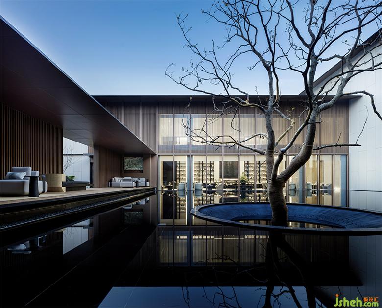 從序廳“詩之山水”到中庭正堂的“匠心書生”的書院文化,最后山重水復(fù)回歸山水,整體打造了一個流暢的觀景動線。