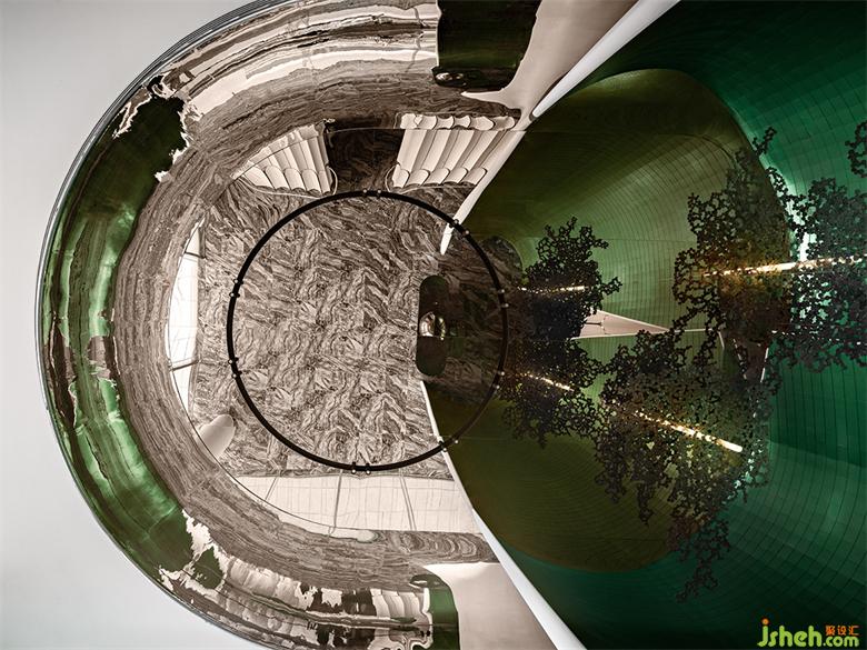 沙盤區(qū)的整體構(gòu)造完美承接空間形態(tài),藝術(shù)裝置采取云的意向,由數(shù)千片手工鍍銀的葉片組成。