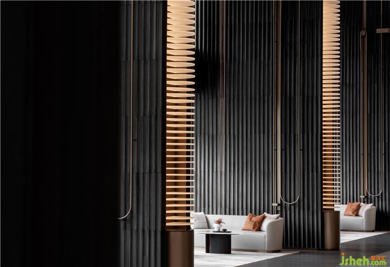 冷峻的柱體雕刻細(xì)節(jié)中的肌理變化,不銹鋼底座搭配金色燈柱,沉著的低調(diào)在材質(zhì)的疊加中營(yíng)造的靜謐氛圍。