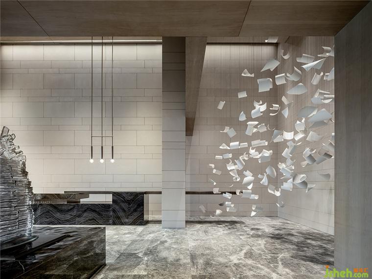 整體空間使用純粹細(xì)膩的沙白色大理石,抽象花紋的大理石地面,銷售中心設(shè)計(jì)配合線型燈具設(shè)計(jì)打造簡(jiǎn)約的空間意境。