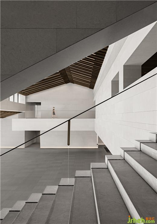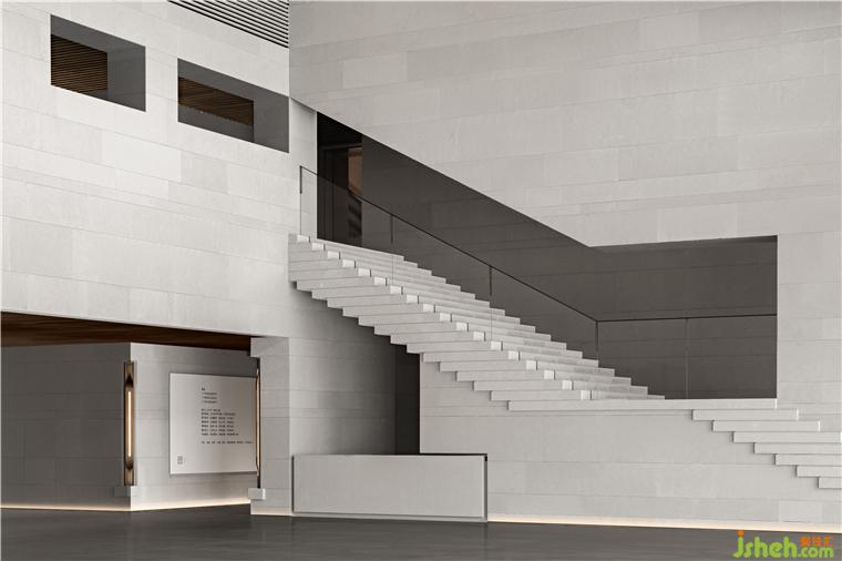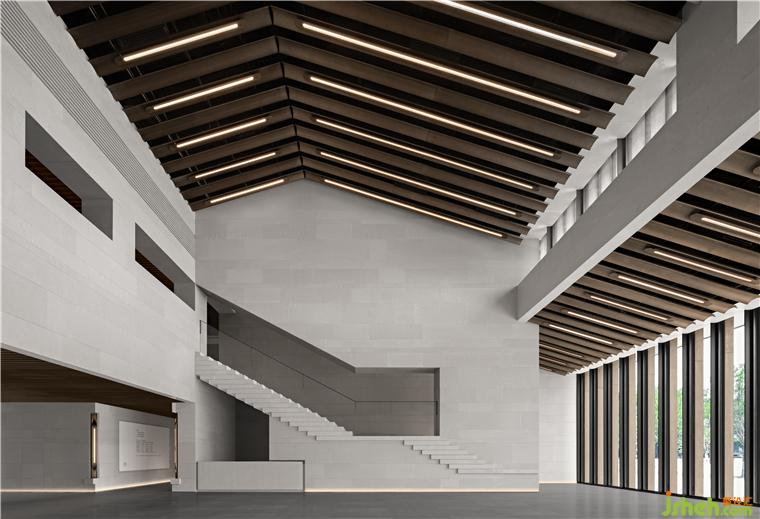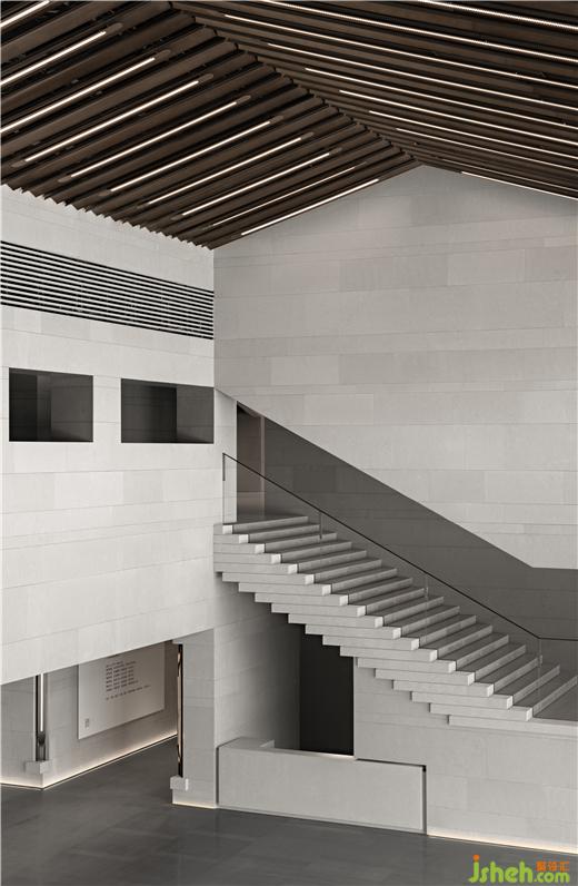 南接待大廳挑空空間,垂拔出宏大莊嚴(yán)的歷史氣息,如瓦片排列的屋脊,在對稱中加入不對稱,水平與塊面的切割,重新塑造體塊關(guān)系。