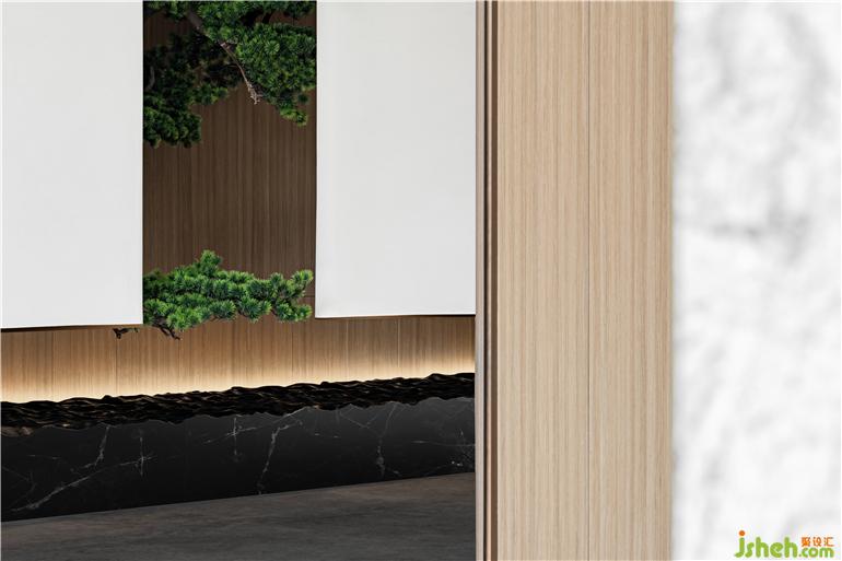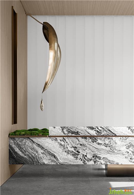“溪水清漣樹老蒼”,本案毗鄰三江口,設(shè)計將寧波的自然風貌融入到細處,黑色大理石象征水的意象,因水而繁榮的城市,吸附了奔涌的訊息,草木豐盛,生生不息。