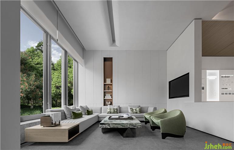 東境潤府營銷中心設(shè)計以空間為系帶,引入寧波的溫婉與俊逸,多功能會客廳的融入將居家體驗及社區(qū)品質(zhì)濃縮到展廳中。
