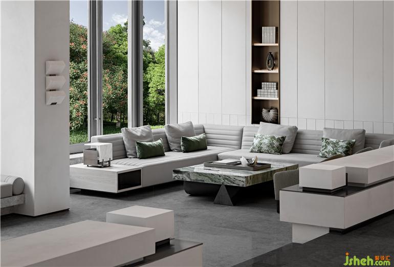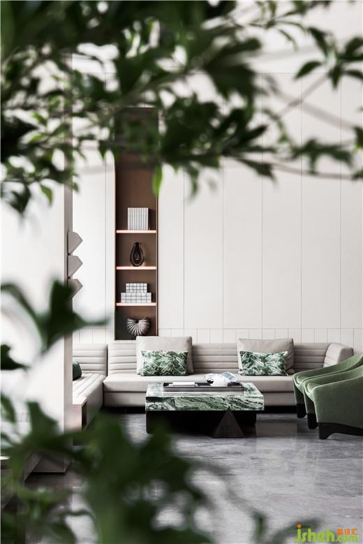 順應自然的有機形態(tài),追隨時光的歸屬記憶,圓潤鵝卵石座椅躺在如堤岸般方正的沙發(fā)旁,東境潤府營銷中心設(shè)計幾何形的精巧壁燈對應茶幾硬朗的線條,碧綠色水波紋流淌串聯(lián),簡潔的設(shè)計語言將空間融于自然環(huán)境中。