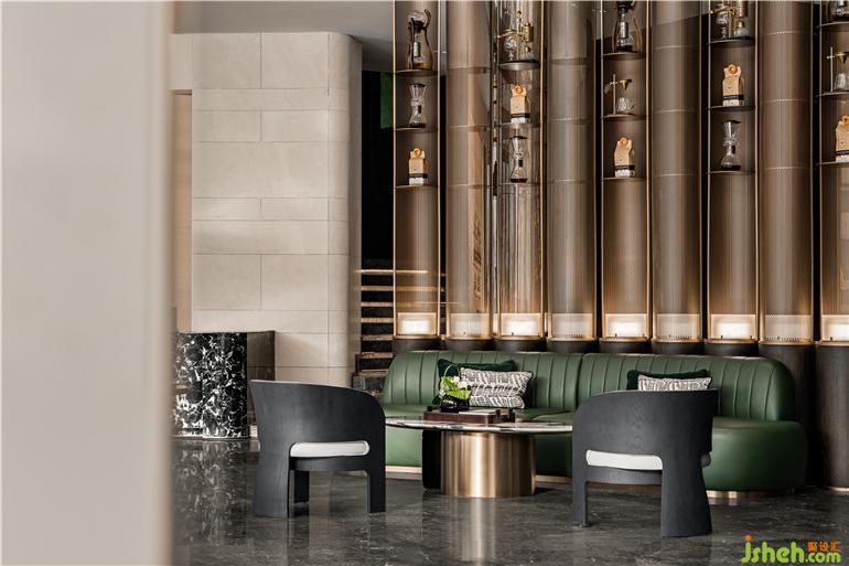 水吧臺基于整體基調,無錫金地華著營銷中心設計沿用前廳的大理石元素,自然氣質與金碧輝煌的酒品陳列交織出低奢的氛圍。于此暢談,輕松恣意。