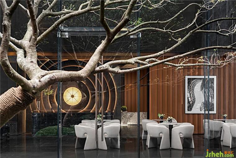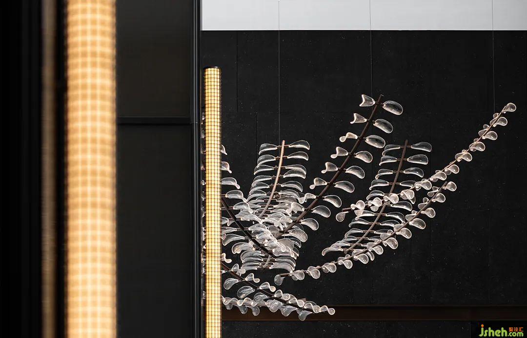 利落的幾何變體作用于空間,如水波紋擴散,如沙脊線暈染,綠意妝點其間,天地自然囊括于此。水吧區(qū)設(shè)計師與施華洛世奇聯(lián)合打造的水晶壁燈,營造空間視覺中心,古銅色金屬的厚重與切工水晶的剔透突破了工藝和創(chuàng)新的界限,照亮一室璀璨。