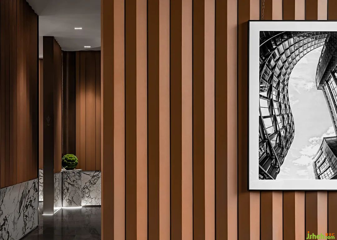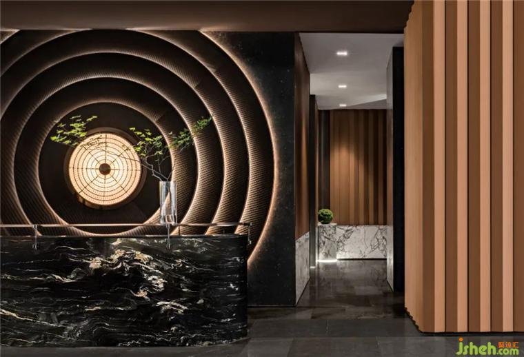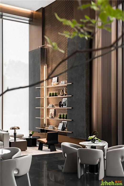 地毯寓意為海洋,蜂巢金屬背景墻折射光線投映到室內(nèi),大氣穩(wěn)重的基調(diào)下又充滿時尚感,木飾面鋪陳敘事,大理石材不同肌理的表達,強調(diào)空間的韻律美與秩序感,成都龍湖瑰云里營銷中心設(shè)計空間之間靜默存在又彼此串聯(lián)。