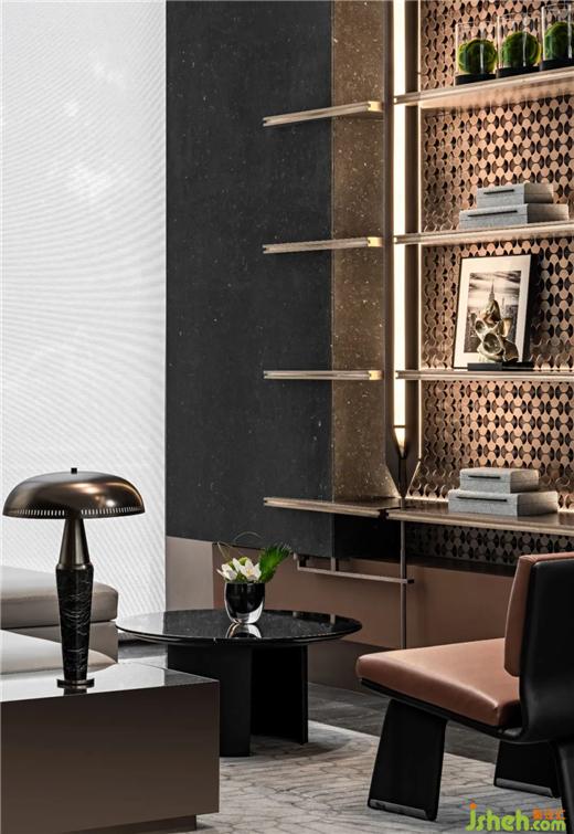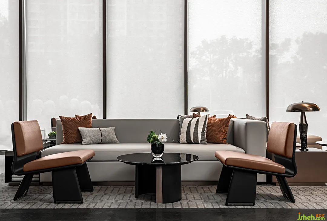 冷暖色組合的圍合性家具,營造家的真實感受和舒適商談氛圍,光影交錯下,一抹活力橘,作為跳躍色點燃空間情緒,傳達著古典與現(xiàn)代并存的奢華美學(xué)。