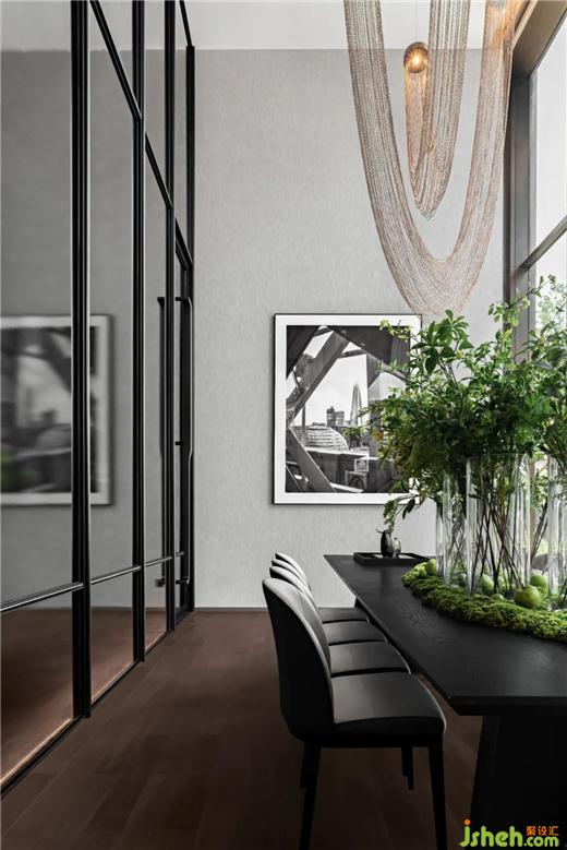挑高的落地窗,猶如巨幅畫框,成都龍湖瑰云里營銷中心設(shè)計將窗外的視野納入室內(nèi),名為Otéro(奧特羅)的銅鏈?zhǔn)止舭摑櫆嘏挠行螣o形,如珠寶墜于美人脖頸,視線過渡到深木色長桌及淺色皮制座椅,桌面自然花藝調(diào)和色調(diào),跳躍其間,整體調(diào)性與自然和諧相成,趣味橫生。