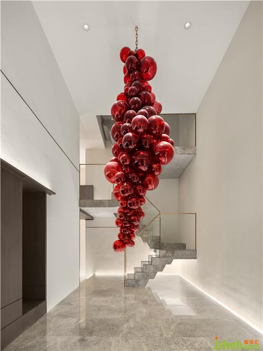 武漢綠城湖畔雲(yún)廬樣板房設(shè)計(jì)空間中聯(lián)結(jié)上下的旋轉(zhuǎn)樓梯與圓潤富態(tài)的葡萄串燈裝置結(jié)合,形體上有了“維納斯雕塑”的美感,好似運(yùn)動(dòng),卻是靜止。
