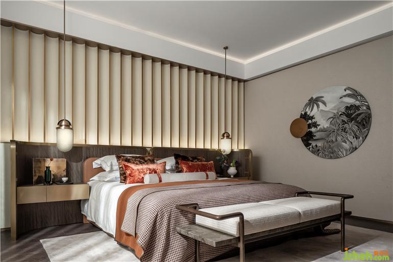莫蘭迪色調(diào)讓主臥帶來溫厚舒適的包裹感,米色的床頭背景墻猶如翻卷的波浪不斷豐富著空間的肌理。