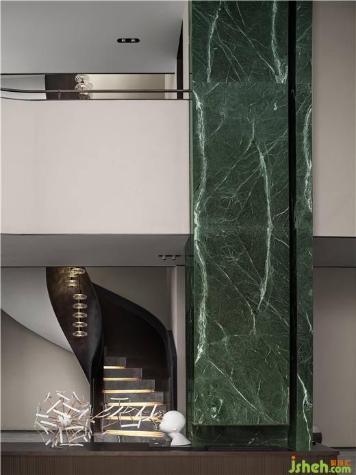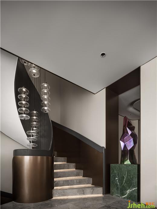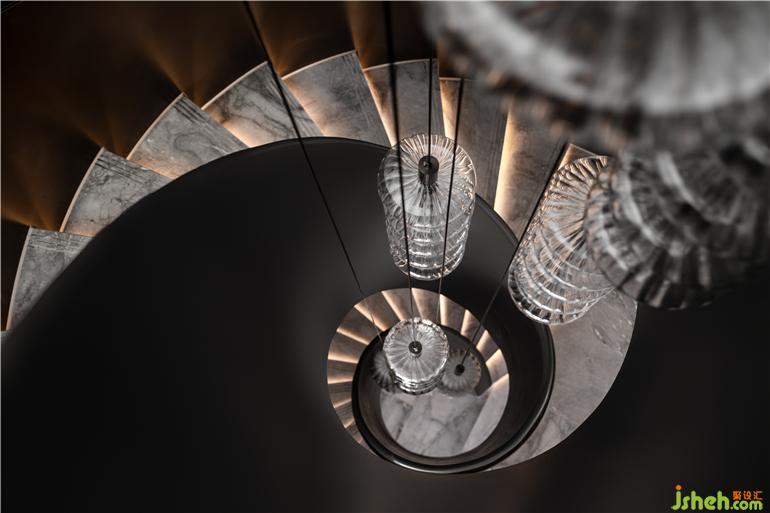 無錫融創(chuàng)CHINA山水江南樣板房設(shè)計(jì)利用不同材質(zhì)特性營造視覺沖突,以多元的變化視角,在空間中著色流光。旋轉(zhuǎn)樓梯擁抱成鸚鵡螺的形態(tài),白色大理石映襯珍珠般的光澤,水晶燈整齊排列,如深海中懸浮的水母,自由的符號(hào)隱晦地在場(chǎng)所中告白。