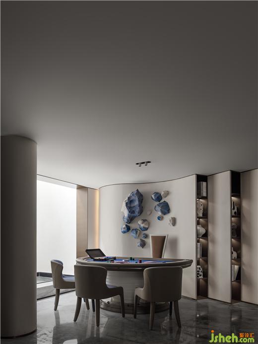 曲線裝飾墻鑲嵌湖石裝置,在光影的作用下,仿佛透過清澈的湖水探到湖底,體塊與色彩的互動(dòng),室內(nèi)與室外彼此映照,無錫融創(chuàng)CHINA山水江南樣板房設(shè)計(jì)探索著社交空間的新造型。