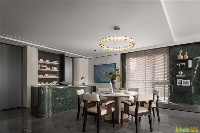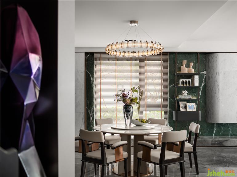 圍坐是中國文化團(tuán)圓和氣親密無間的表象,花藝迎接陽光,與自然風(fēng)光交織出靜謐恣意的氛圍,天花上游魚吊燈點(diǎn)亮串聯(lián)空間的”太湖碧波“,如果空間是一首詩,也要是主題鮮明的那一首。