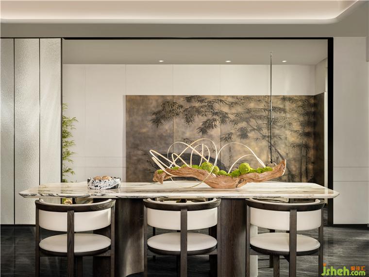 島臺如海水江崖,遠觀似山,近觀似水。抽取蜀錦的元素,對傳統(tǒng)紋樣元素的延展,龍湖恒邦·花千樾別墅設計將海岸灘涂的紋理與粗粒顆粒質感結合。線面精致分隔餐廚區(qū)域,營造韻律感空間褶皺。
