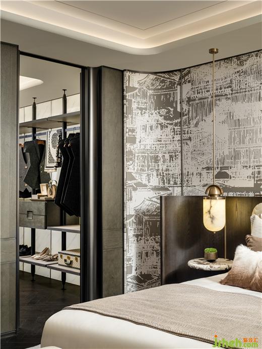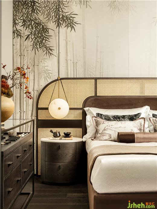 新月懸浮兩側(cè),搭配古典家具演變的條案,竹影策策的床頭背景墻四湖漾山水翠,又似庭院深深里,龍湖恒邦·花千樾別墅設(shè)計(jì)便是中式復(fù)古的設(shè)計(jì)也暗藏?zé)o限生動(dòng)氣韻。