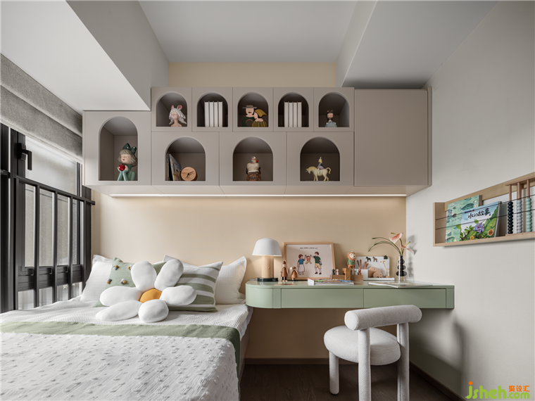 臥室草綠與白色相間的床品呼應(yīng)著夢幻的童話故事,馬卡龍的色彩散發(fā)著甜蜜的女孩氣息,當(dāng)陽光透過玻璃滲入,自由的精靈便在此飛舞,照應(yīng)著空間靈動的光翳。