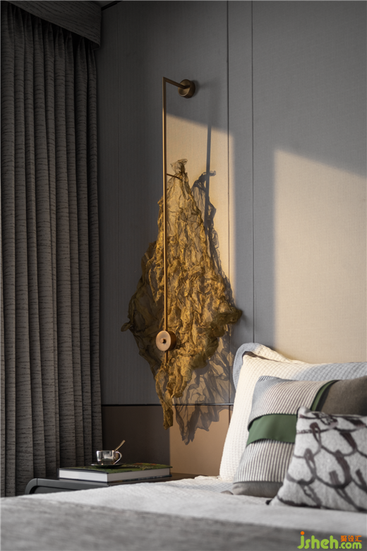 淺灰色木飾面帶來足夠安全的包裹感,深灰半圓的床頭柜輕巧精致,配上金屬臺(tái)燈極富質(zhì)感,左側(cè)的干草藝術(shù)裝置,破除了對(duì)仗的統(tǒng)一,帶來了更為新鮮的視覺體驗(yàn)。