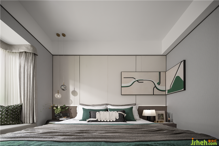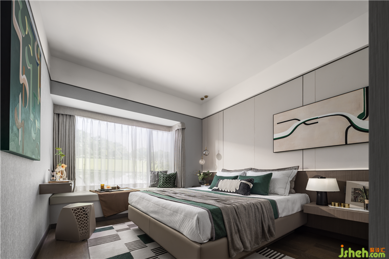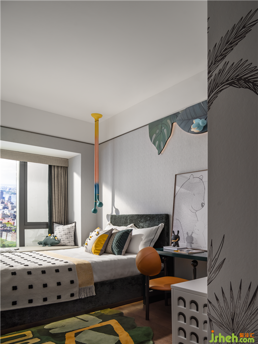 萬科樣板房設(shè)計(jì)以官綠、黃白游為空間主色彩,傳統(tǒng)細(xì)膩的中國(guó)色給予靜謐美好的歲月沉淀感。墻面大塊面的葉片裝飾畫與床品及地毯形成呼應(yīng),仿佛居住在森林一般。
