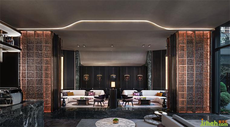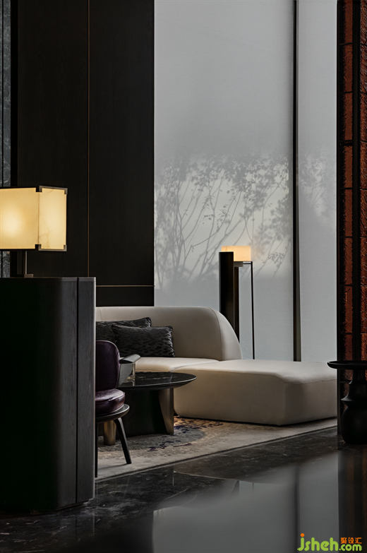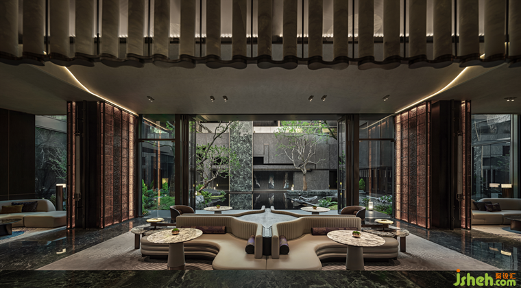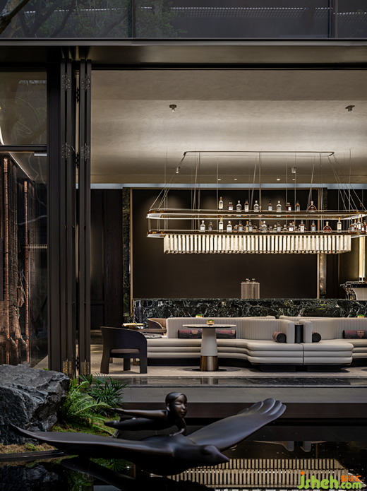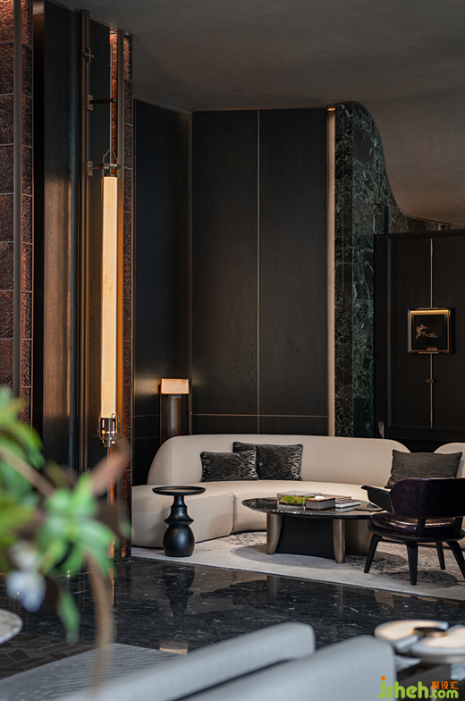 臨窗而坐,推窗即景,室內(nèi)空間與庭院景致相映成趣,洽談區(qū)以半圍合的布局,遞進(jìn)式地形成了自由淺洽區(qū)和靜謐深洽區(qū),兩者互不干擾。各類奢石、古銅金屬呈現(xiàn)出沉穩(wěn)奢華質(zhì)感。