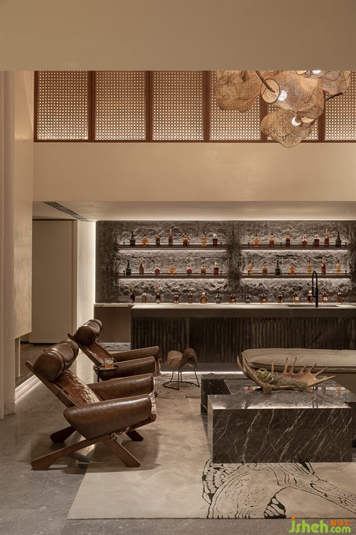 負(fù)一樓為空間的底層挑空,意為水流匯集成譚之地,空間采用大面積的水波紋樣地毯為中心,孤形沙發(fā)環(huán)繞而坐,逐溪而居,映照出另一片天地,讓人不禁沉浸于此,閑畫(huà)孤林在山間,對(duì)應(yīng)自然規(guī)律。