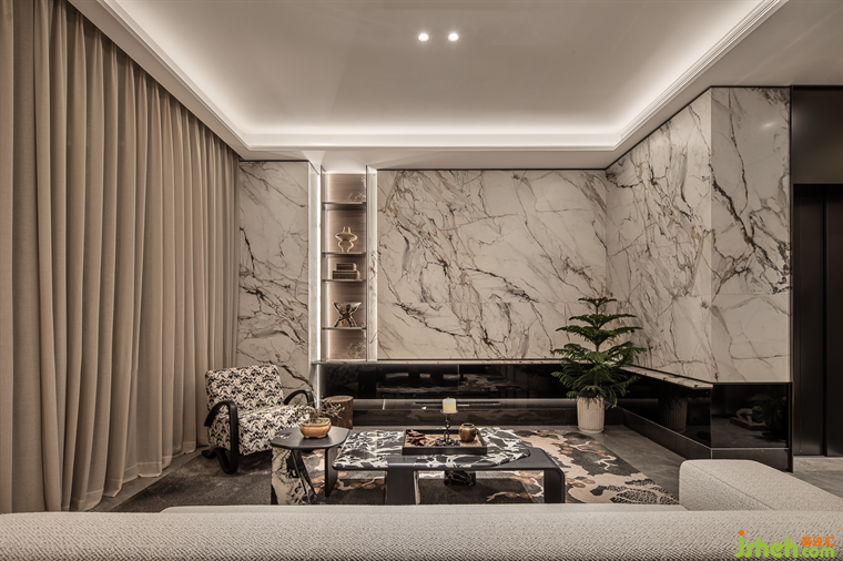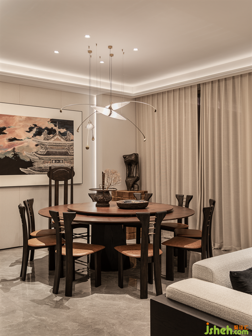 客餐廳選用滕王閣元素作為主題藝術(shù)畫強(qiáng)調(diào)了空間的在地性和歸屬感,大面積松韻地毯將空間主題串聯(lián)。南昌地域性元素與東方自然元素,營(yíng)造雅士登高望遠(yuǎn),依山而居的愜意生活場(chǎng)景。