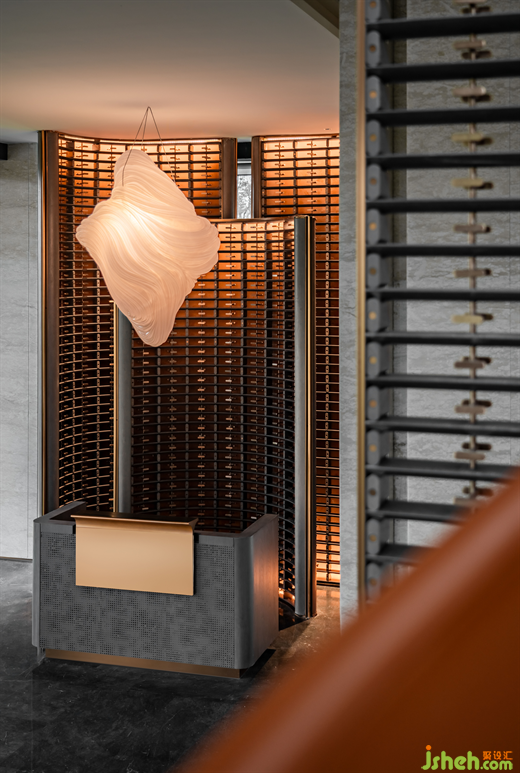 接待臺以不規(guī)則吊燈呼應寄暢園的游園之景,曲面的堆疊如園景中的奇石,又如湖水漣漪的暗紋,柔和的暖光亦似水中月影,營造了空間的獨特氣質,游走于東方詩性之境,開啟序言之門。