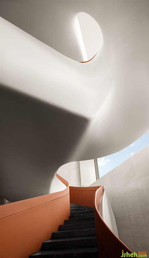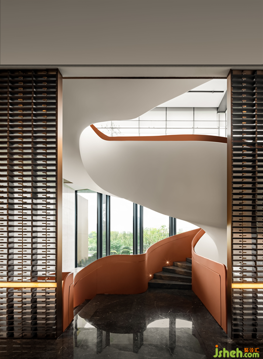 東方紅與雅白交疊的藝術旋梯綿延而上,去繁從簡,延續(xù)經典,營銷中心設計承載著東方園林曲徑通幽的婉轉與詩意,宛如一條縹緲的緞帶,于空中輕舞,譜寫方寸間的優(yōu)雅浪漫。