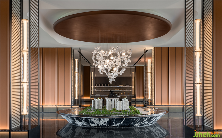 沙盤區(qū)融入太湖石的形與意,以藝術吊燈裝置構成“隱室”及“隱石”兩條脈絡,將太湖石的“漏、透”之美極致隱喻,流光透影,虛實交錯。翠竹修,畫屏幽。走道兩旁的壁燈汲取了竹節(jié)元素,在當代藝術語境下重塑東方美學神韻,于線條的勾勒中展現(xiàn)禪意與生機。