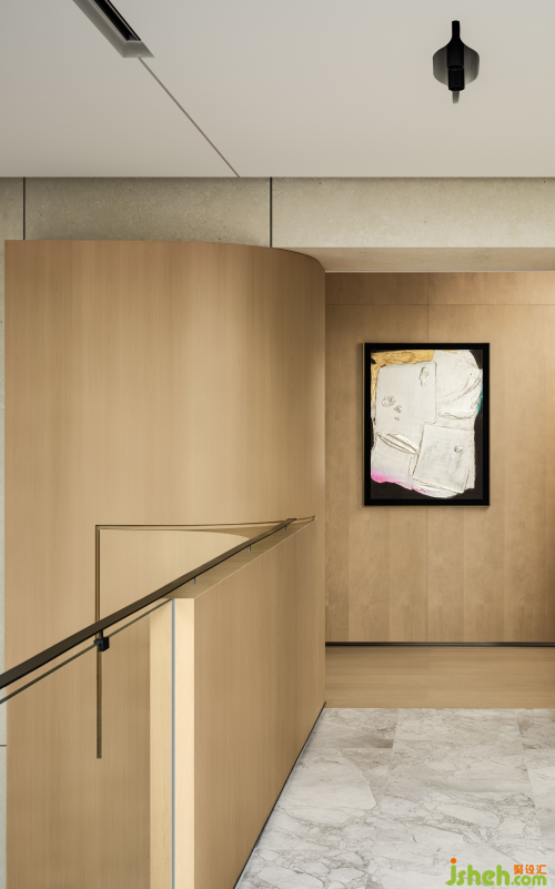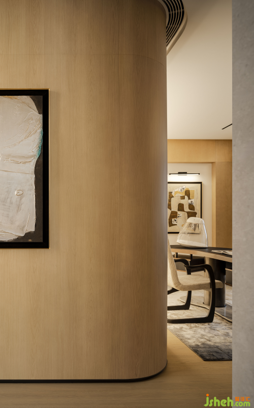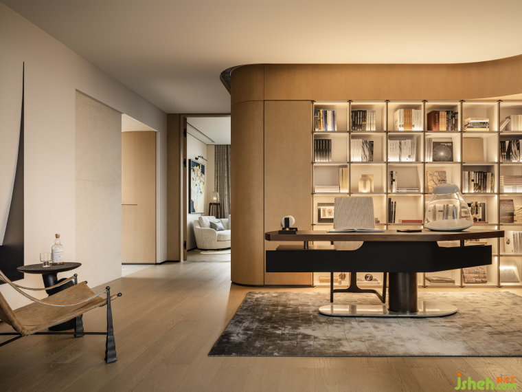 轉(zhuǎn)角之處,流動(dòng)的線條如同生命的低語(yǔ),它們不拘一格,隨性而優(yōu)雅,為這繁華都市中的一隅留白,也為生活中的可能性留出余地。書(shū)房,則是靈魂的避風(fēng)港。定制的曲面書(shū)架,既滿足了收納與工作的實(shí)際需求,又以獨(dú)特的形態(tài)訴說(shuō)品味。