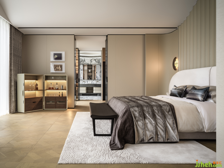 “我們?cè)谂P室營(yíng)造一種靜謐的奢華感,把空間更多讓位于?景,居住者獲得更多精神的滋養(yǎng)?!薄S全