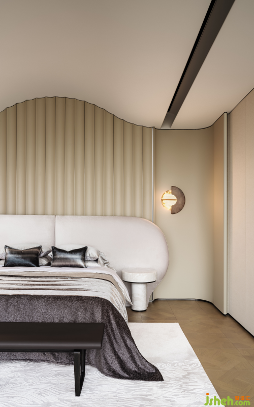 靜奢主義,是一種低調(diào)奢華的風(fēng)格,強(qiáng)調(diào)簡(jiǎn)約、舒適和質(zhì)感。?床頭背景墻,靈感源自廣府古韻的鑊耳屋,樣板房設(shè)計(jì)以現(xiàn)代皮革材質(zhì)重塑經(jīng)典,不僅觸感溫潤(rùn),更添一抹地域文化的深邃與雅致。