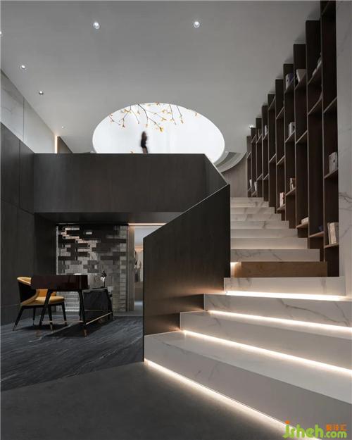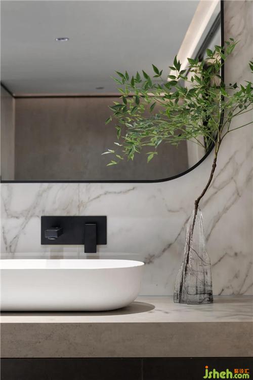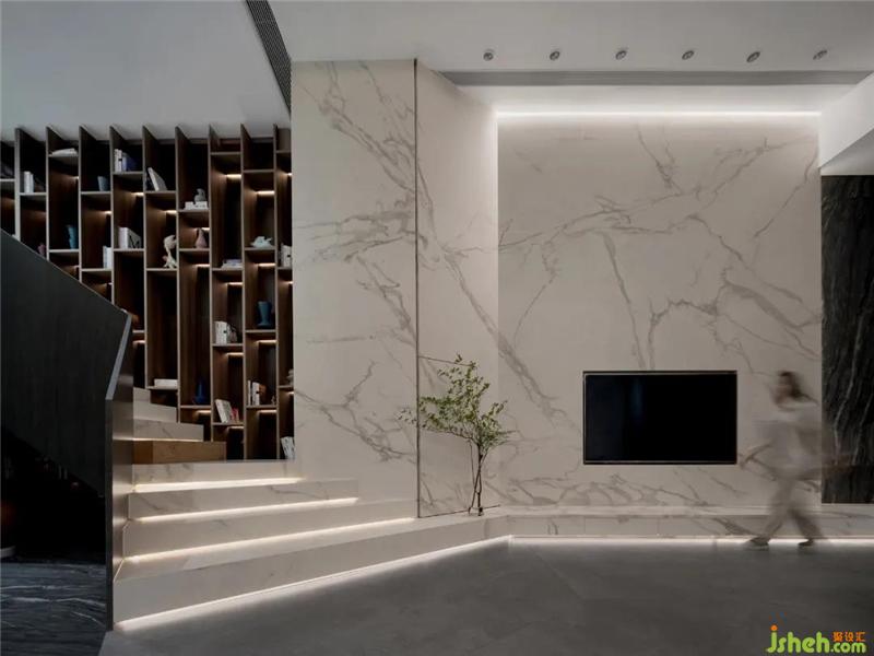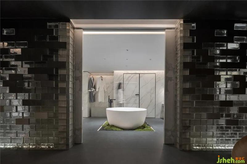 衛(wèi)浴的燈光透過玻璃墻,若隱若現(xiàn)的身影與懸浮的巖板磚重合,多了點(diǎn)小趣味。“扎哈石”邊長出了苔蘚,展廳裝修設(shè)計(jì)被濕潤的空氣滋養(yǎng)著。你浸著牛奶浴,香氣撲面而來,一天的疲憊煙消云散。