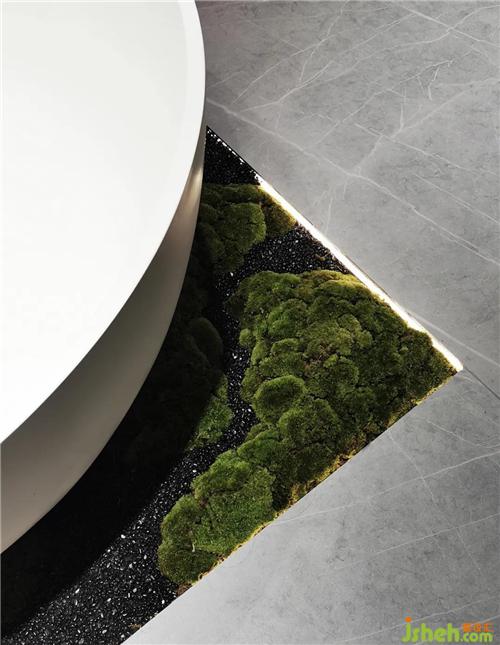 The bathroom lighting through the glass wall, looming figure and suspended rock tiles overlap, more fun. Moss grows on the edge of "Zaha Stone", which is nourished by moist air. You soak in milk bath, aroma comes to your face, the exhaustion of the day disappears.