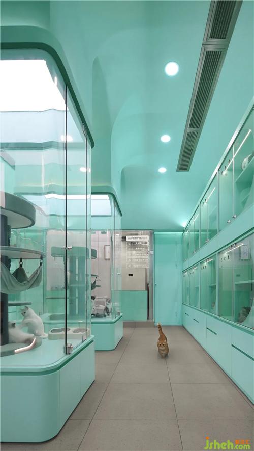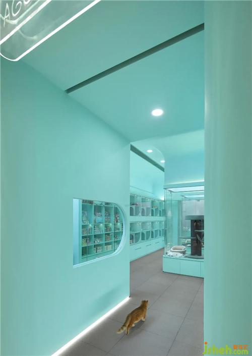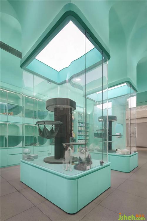 The combination of central column display and arc roof brings an upward visual tension. The lamp film creates a soft feeling like skylight, which is not only the main light source of the space, but also will not bring discomfort to the cats.