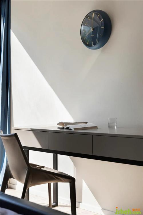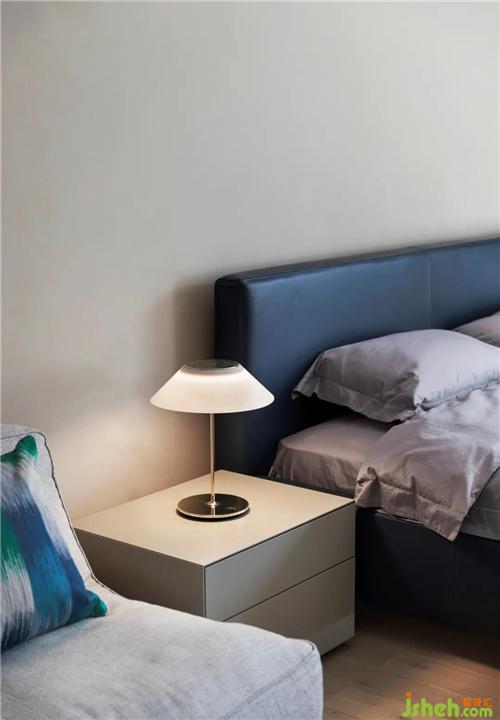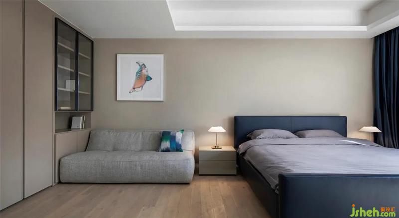 裝修設計主臥更是把駝棕和蔚藍這兩種色彩運用得愈加飽滿。斜陽和煦,心生安定。