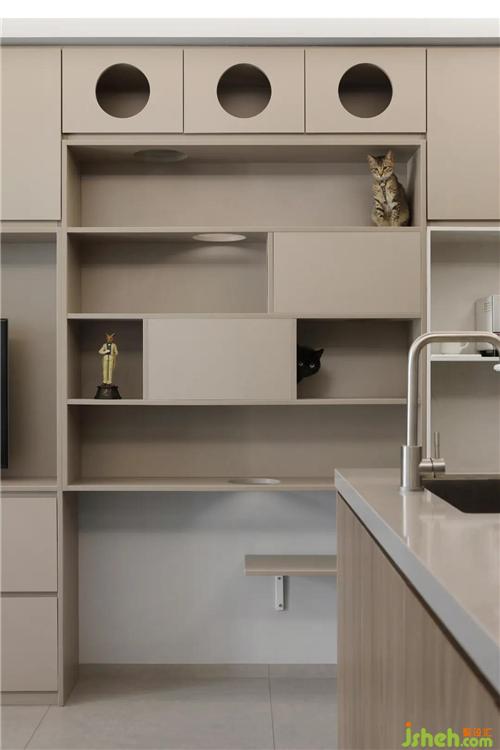 可以躲貓貓的整體家具定制,是第二處空間魔法。貓咪敏感而獨(dú)立,喜歡高處和狹小的空間,在這個(gè)空間里,它能夠掌控一切。貓空間的設(shè)計(jì),同時(shí)滿足了咪醬的安全感和好奇心,它便會(huì)全身心投入到舒適的生活中,閑情雅致與人互動(dòng)。