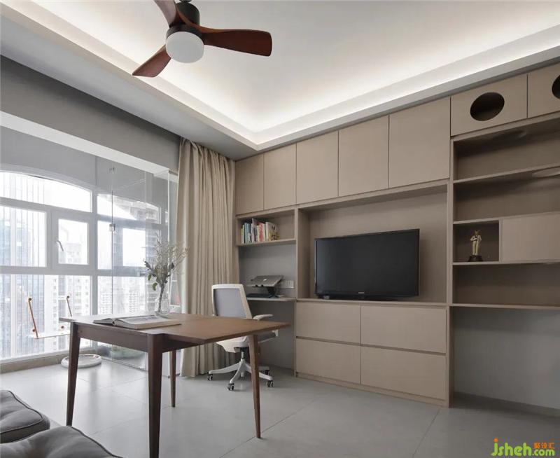 The combination of living room, dining room, work area and pets' area is the result of living habits. Watching a movie at dinner and accompanying pets at work are not without pleasure.