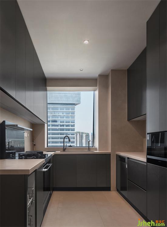 前文提到的設(shè)計手法一直延伸到主臥內(nèi)。主臥復合了書房、衣帽間、臥房、主衛(wèi)四個功能,由多道暗門及隱藏門來分隔。家裝設(shè)計特殊定制的床頭裝置是空間中的亮點,即是燈具,也是屏風,巧妙揉和。